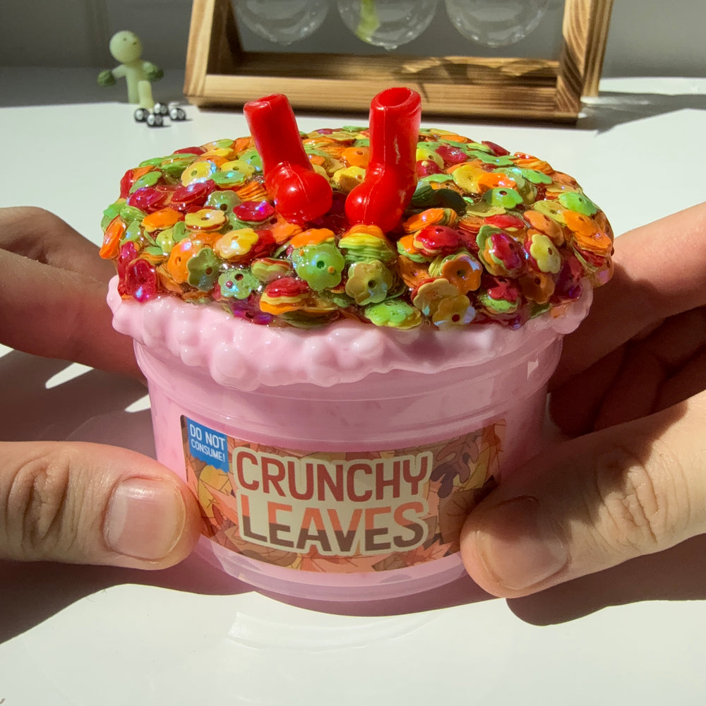 Crunchy Leaves is a pink white glue slushee slime that comes with a 2 ounce sequin flower topping as well as 2 boot charms! Also comes with an amazing GUAVA FRUIT SCENT 🤤Â